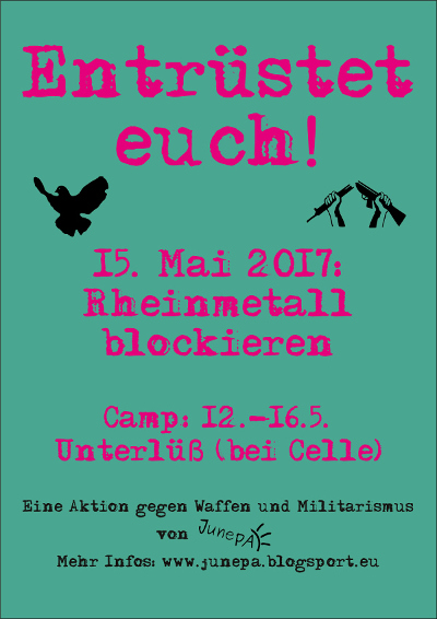 JunepA, das "Jugendnetzwerk für politische Aktionen", wird am Montag, den 15. Mai, eine Blockade bei Rheinmetall Unterlüß veranstalten. Wir finden das sehr gut und weisen deshalb auf die Aktion hin. Hier der Aufruf von JunepA: