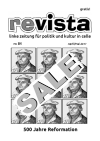 Die aktuelle Ausgabe der REVISTA bietet wieder etliche Artikel zu kommunalpolitischen Themen, so z.B. Fahrradverkehr, Sozialticket, Nigges Personalpolitik, den "Brandbrief" von Ehrenamtlichen in der Flüchtlingssolidarität. Geschichtlich interessant Artikel zum Reformationsjahr - so erfahren wir, dass Herzog Ernst nicht nur ein Bekenner war, sondern sich seines Haushaltsproblem durch den Zugriff auf die Reichtümer katholischer Einrichtungen entledigte. In einem weiteren Artikel werden die Thesen des Vortrags von Jens-Christian Wagner (Von Luther zu Hitler) kurz zusammengefasst. Und es gibt einen Rückblick auf die Entstehungsgeschichte des Mahnmals in den Triftanlagen und die seinerzeitigen Diskussionen.