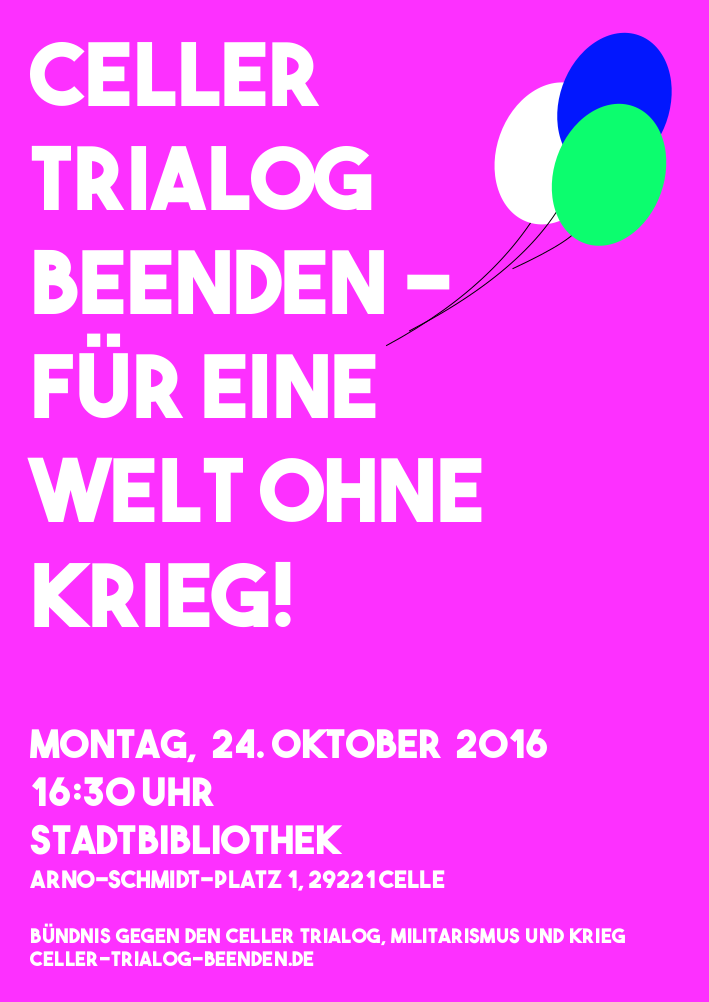Das Bündnis gegen den Celler Trialog, Militarismus und Krieg hat zu dem am Montag, den 24.10.2016, in der CongressUnion beginnenden Celler Trialog eine Demonstration angemeldet. Sie beginnt um 16.30 Uhr an der Stadtbibliothek und führt anschließend durch die Altstadt. Hier der Aufruf:
