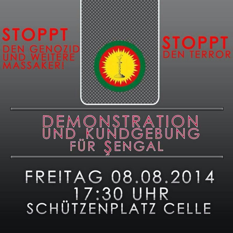 Mit Entsetzen verfolgen die Êzîdinnen und Êzîden in Celle an diesem Wochenende die Offensive der Terrororganisation Islamischer Staat (IS) in der Region Shingal. Die Islamisten eroberten mehrere êzîdîsche Städte und Ortschaften. Bewaffnete êzîdîsche Zivilisten leisteten zwar lange Widerstand, konnten ihn jedoch nicht weiter aufrecht erhalten. Tausende Êzîdinnen und Êzîden sind nun auf der Flucht und fürchten, dass sie einem Massenmord durch die IS-Terroristen zum Opfer fallen könnten.