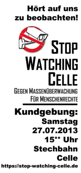 Auch in Celle gibt es, initiiert von den Kreisverbänden von Bündnis 90/Die Grünen und Piraten, ein Bündnis, das zu einer Kundgebung aufruft; mehr zu Celle unter https://stop-watching-celle.de/ und zu bundesweiten Aktionen unter demonstrare.de