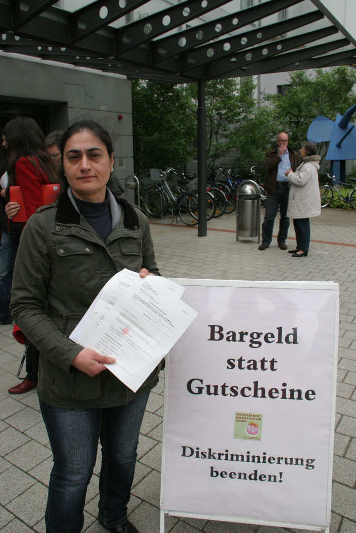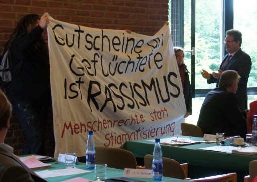 Das Thema "Bargeld statt Gutscheine" für Asylbewerber*innen ist in Celle nach wie vor nicht vom Tisch. Aus diesem Grund gab es während der letzten Kreistagssitzung am 26.06.2013 eine Solidaritätsaktion im Kreistagssaal (siehe Foto). Am 22.06.2013 berichtete Joachim Göres in der TAZ unter der Überschrift "Wenn die Kassiererin den Ausweis verlangt" darüber, dass nur die Landkreise Celle, Vechta und Harburg - also drei von 48 - in Niedersachsen das Gutscheinsystem noch nicht abgeschafft haben (download unten). Im Niedersächsischen Landtag gab es schon am 30. Mai eine sehr umfangreiche Fragestunde zum Thema.