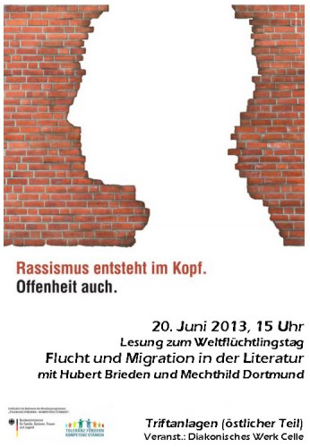 Zum "Welttag der Flüchtlinge", am kommenden Donnerstag, den 20. Juni, veranstaltet das Diakonische Werk Celle in Kooperation mit dem AK Ausländer eine Open-Air-Lesung im Ostteil der Triftanlagen. Zwischen 15 und 16 Uhr werden Hubert Brieden und Mechthild Dortmund Texte zum Thema "Flucht und Migration in der Literatur" lesen. Mit dem Leben von Flüchtlingen und Migranten haben sich SchriftstellerInnen unterschiedlicher Zeiten auseinandergesetzt: mit der Situation im fremden Land, den bürokratischen Schikanen den Schwierigkeiten des tagtäglichen Überlebens, den Übergriffen der Polizei und dem überall spürbaren Rassismus. Das Motto gibt ein Zitat von John Steinbeck: "Sie hassen euch, weil sie Angst haben." Neben Steinbeck kommen in der Collage zu Wort Traven, Brecht, Seghers, Galeano, Mejides, Rodriguez und Boyle.