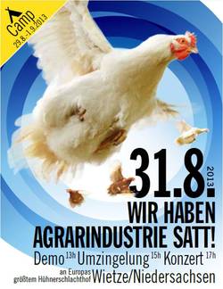 Schon mal zum Vormerken: Nach den „Wir haben es satt!“-Demonstrationen in Berlin macht die "Kampagne Meine Landwirtschaft" nun zum ersten Mal eine Sommeraktion. Vor den Bundestagswahlen geht's an einen Brennpunkt der Agrarindustrie - zum größten Geflügelschlachthof Europas in Wietze/Niedersachsen, in dem 430.000 Hühner täglich geschlachtet werden sollen. Der Schlachthof ist ein Symbol für die verfehlte Agrarpolitik der Bundesregierung und die Auswirkungen der Agrarindustrie.