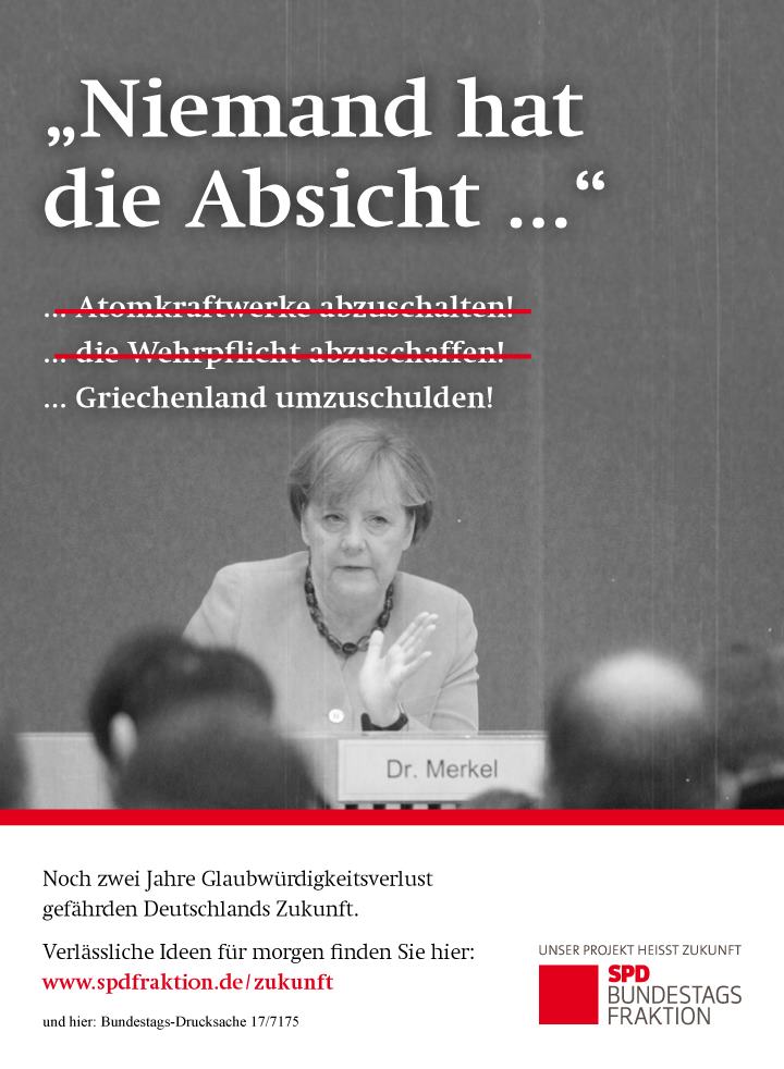 Interessanterweise hat die SPD vor zwei Jahren in einer Anzeige das Ulbricht-Zitat ebenfalls verwendet, aber im Unterschied zu Müller direkt auf eine Person bezogen, nämlich Kanzlerin Angela Merkel (siehe links).