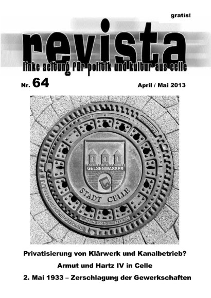 Die aktuelle "revista - linke zeitung für politik und kultur" hat als Schwerpunktthema die angestrebte Teilprivatisierung von Klärwerk und Kanalbetrieb in Celle. Artikel u.a.: "Hände weg vom Tafelsilber / Privatisierungpläne? Wegspülen!", "Die Gelsenwasser Aktiengesellschaft / "Uns reicht ... 25 Prozent", "Geheimoperation Gelsenwasser / Wahrheit kommt nur tröpfchenweise", "Geschäftsmodelle der modernen Alchemisten / Wie man aus Scheiße Gold macht", "Positionen der Ratsfraktionen", "Interview mit Peter Rosenbaum (BiBS im Braunschweiger Rat) / Water makes Money in Braunschweig". Zum download gibt's das Ganze unter http://www.revista-online.info/