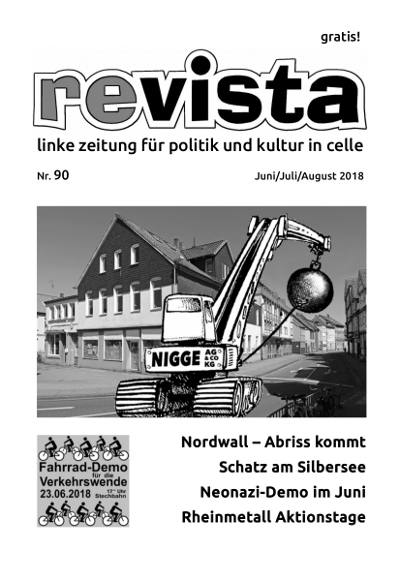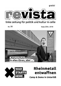 Die revista #91 für September/Oktober ist "auf dem Markt". Themen u.a.: Camp und Demonstration am Rheinmetall-Standort Unterlüß + Whistleblowing + Landtagsresolution zu Waffenexporten + Fluchtursachen + Unterschriftensammlung "abrüsten" + Grundstücke nur für Uniformträger*innen + Betriebsratswahlen und Tarifabschlüsse 2018 + Ostumgehung + Earth Overshoot Day + Seebrücke + Höcke in Winsen + AntiFa: Patrioten und Nahtz + Schlosstheater + Filmreihe zu Marx + We'll Come United-Parade + 1968: Schul - Schul - Schulreform + revista-Minigolf-Open ...