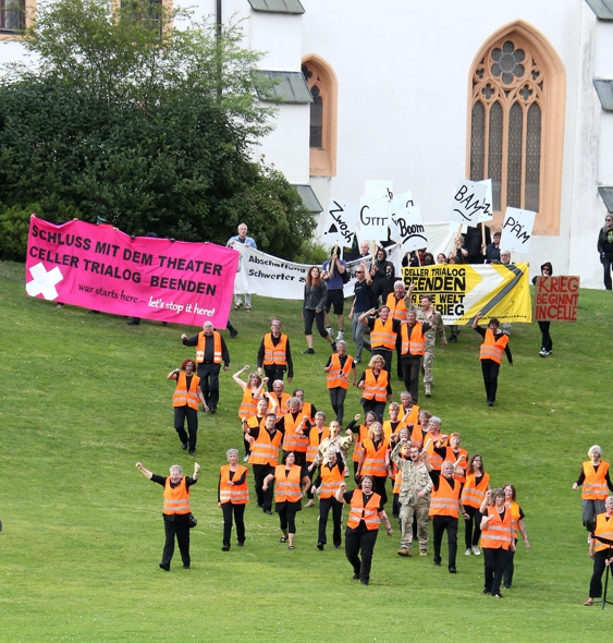 Gefreut hat uns selbstverständlich auch, dass für einen kurzen Moment "die Wirklichkeit" sich einen Raum im Stück eroberte, als die Gruppe rund ums Bunte Haus uns damit konfrontierte, dass "JA" oder "NEIN" Positionierungen erfordern, z.B. für oder gegen das jährliche Treffen der Rüstungslobbyisten beim so genannten CELLER TRIALOG.