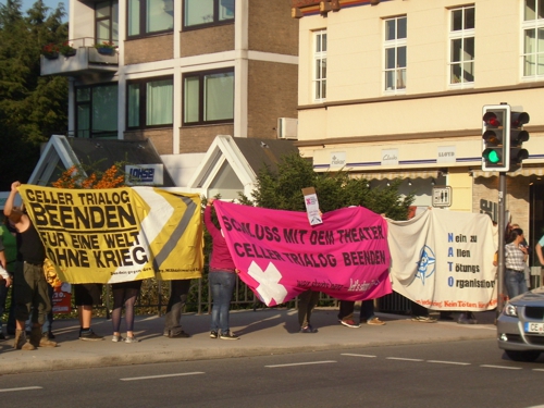 Unter diesem Motto fand am ersten Tag des diesjährigen Celler Trialogs eine Dauermahnwache auf dem Arno-Schmidt-Platz vor der Stadtbibliothek statt, die erfreulichen Zuspruch bei vielen Passant*innen fand. Als die Trialog-Teilnehmer*innen gegen 17 Uhr von der Union zu Serenade vorm und Dinner im Celler Schloss gingen mussten sie vorbei an einer Spontan-Demo, die mit Transpareten und Sprechchören "friedlich und unter freiem Himmel" forderte: Schluss mit dem totbringenden Rüstungslobbyismus. Während SPD und Bündnisgrüne in Celle anscheinend nichts zu dem unverholenen Rüstungslobbyismus des Bundestagsabgeordneten Henning Otto und seinem Kooperationspartner, der Deutschen Gesellschaft für Wehrtechnik (DWT), zu sagen haben, hatten sich Behiye Uca und Oliver Müller nicht nur im Vorfeld kritisch geäußert, sie unterstützten jetzt auch die Protestaktion mit ihrer Anwesenheit.