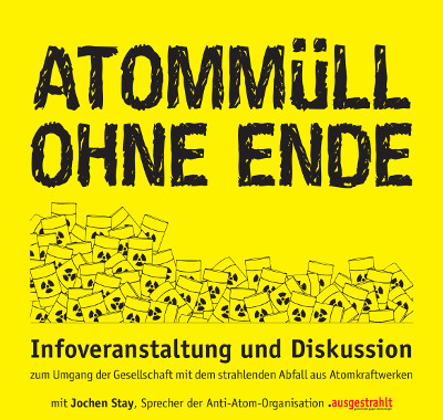Am Dienstag, den 11.11.2014, referiert Jochen Stay von ausgestrahlt.de um 19.30 in der VHS Celle, Trift 20 (Saal), zum Thema „Atommüll ohne Ende“. Er stellt die Frage: Wie geht unsere Gesellschaft mit den strahlenden Abfällen aus Atomkraftwerken um? Sein besonderes Augenmerk gilt dabei der im Frühjahr eingerichteten Atommüllkommission. Der Eintritt zu dieser Veranstaltung vom Celler Forum gegen Atomenergie und der RLS Niedersachsen ist frei.
