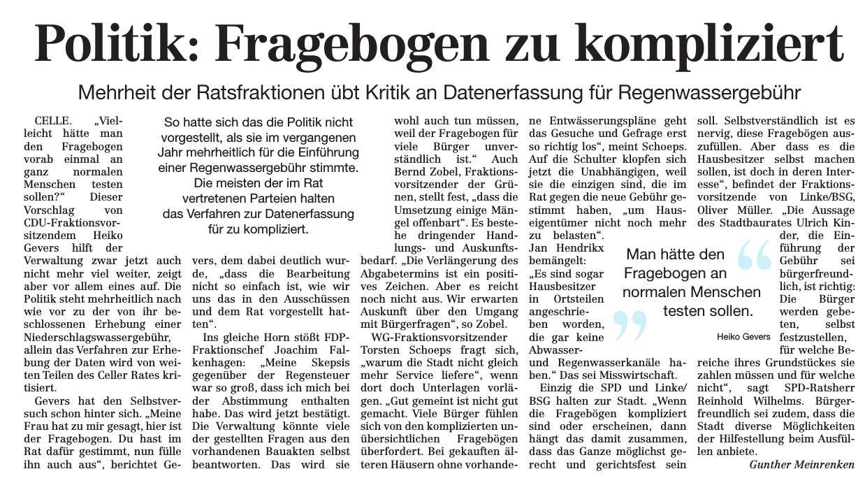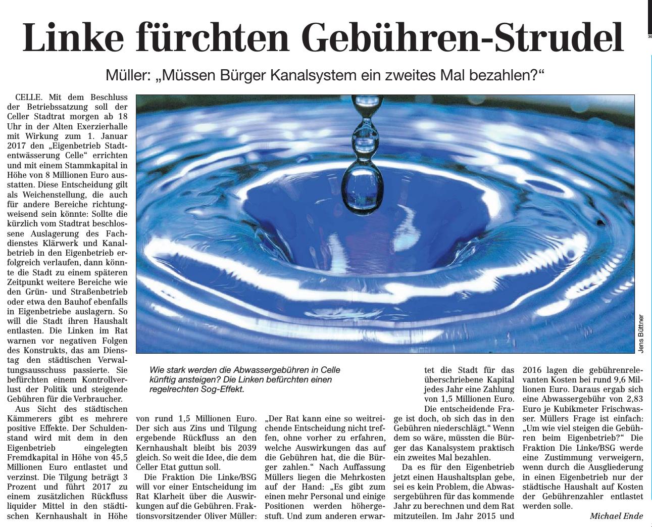 20160929 CZ Linke fürchten Gebühren-Strudel / Müller: "Müssen Bürger Kanalsystem ein zweites Mal bezahlen?"