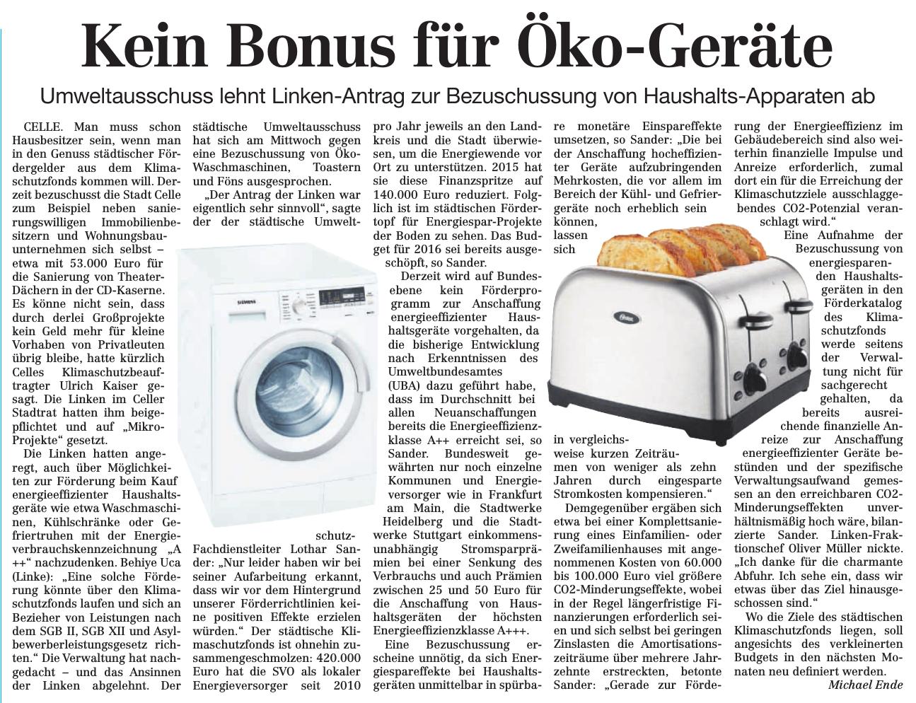 20160311 CZ Kein Bonus für Öko-Geräte / Umwelt-Ausschuss lehnt Linken-Antrag zur Bezuschussung von Haushalts-Apparaten