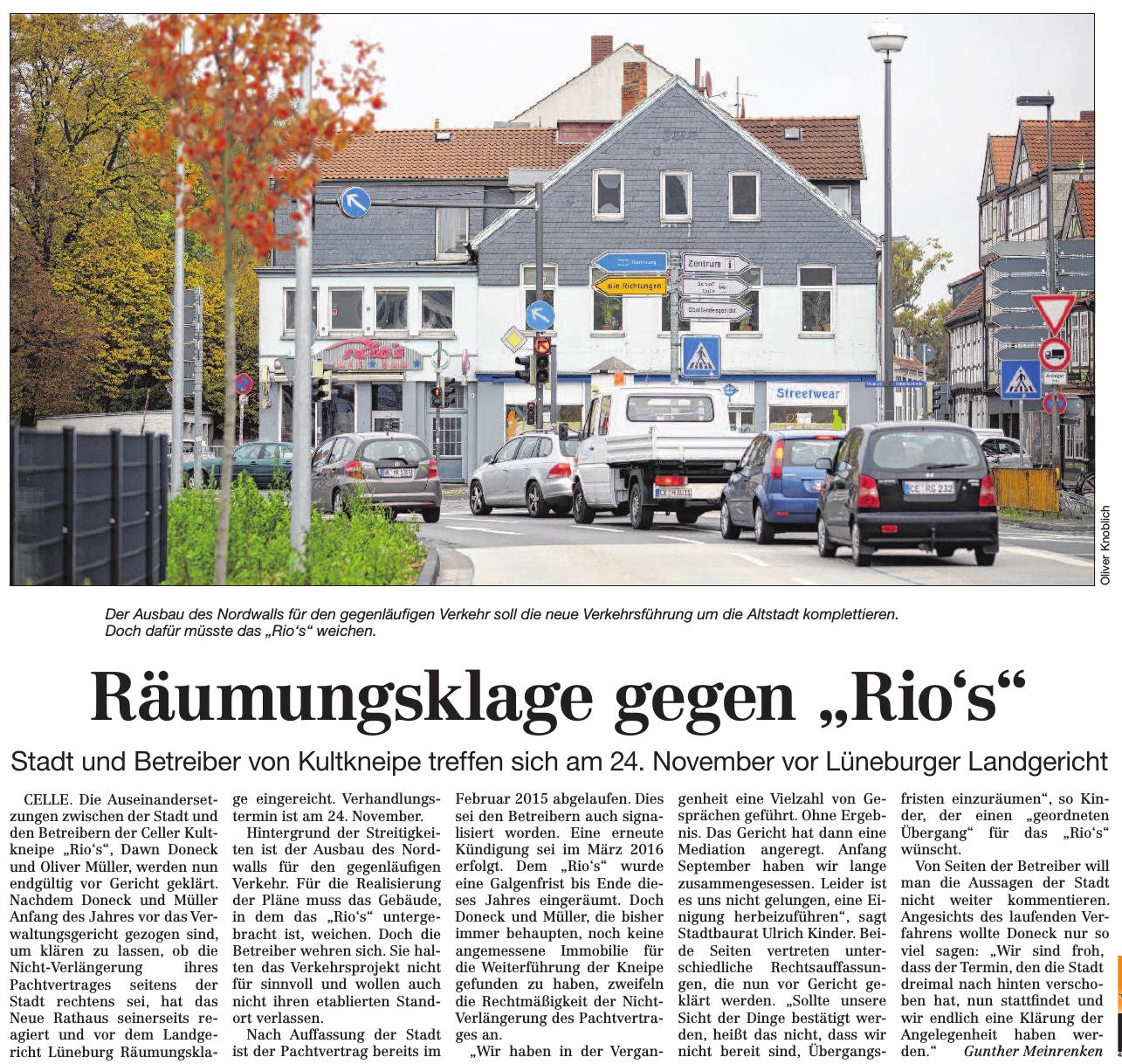 20161101 CZ Räumungsklage gegen Rio's / Stadt und Betreiber von Kultkneipe treffen sich am 24. November vor Lüneburger Landgericht