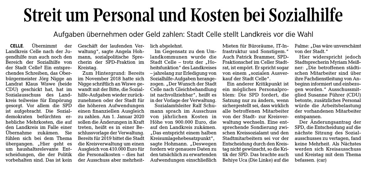 Etwa überrascht war die Kreistagsabgeordnete Behiye Uca (Die Linke) als jetzt im Sozialausschuss des Kreistags über das Anliegen der Stadt Celle informiert wurde, die Aufgaben nach dem SGB XII - also z.B. Grundsicherung im Alter - an den Landkreis zurückzugeben: "Grundsätzlich spricht nichts dagegen, dass die Stadt sich von den Kosten dieser Aufgabe befreien will. Ich aber habe in der Auschussitzung das erste Mal davon gehört, meine also, dass der Oberbürgermeister den Rat nicht über seine Absicht informiert hat."